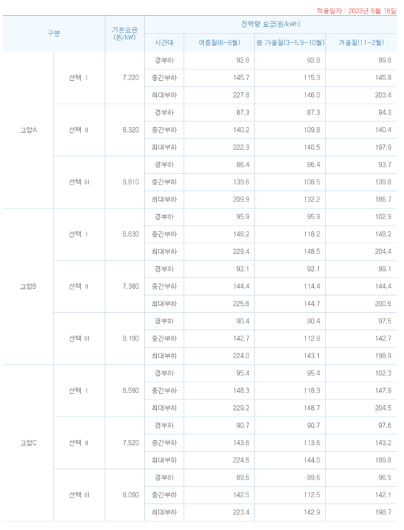 제조업 국가인 우리나라의 상황은 괜찮을까요? 위 표는 계약전력 300kw 이상의 고객(어느정도 규모가 되는)에게 적용되는 산업용 전력 요금표이며, 사용 시간대별로 요금은 매우 변동이 심합니다. 2023년 8월 기준 시간대별 평균으로 치면 아마 기업체별로 평균 140원~160원/kwh정도를 부담하고 있을 것으로 보입니다. 여기에 기본요금, 기후환경요금, 연료비조정요금, 부가가치세 등을 하면 전기요금은 대략 200원/kwh에 육박할 것으로 보입니다. 제가 있는 곳도 7월분 요금을 대략 계산해 보니 195원/kwh 정도로 계산되네요. 많이 올랐습니다. 산업용 전력 요금이 적게 쓰는 가정집 전력 요금에 비해서는 오히려 비쌉니다.
