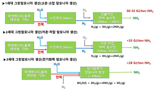 그린 암모니아(재생에너지로 만들어진 암모니아)는 1. 공기에서의 질소 분리, 2. 수전해에서 수소 분리, 3. 고온, 고압에서의 암모니아 합성 반응, 4. 암모니아 액화 및 운송에 많은 전력이 필요합니다. 국내에서는 에너지기술연구원에서 2단계 개발단계에 와있고, 아직 경제성 있게 암모니아를 생산하는 방법은 없는 것으로 보입니다.