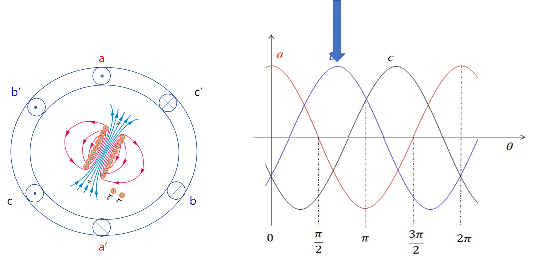 [그림3]를 살펴보겠습니다. [그림 3]에서는 3상 회전자계의 파란색 화살표 시점, 즉 π/3 시점을 살펴봅니다. a상은 -, b상 +, c상은 - 시점입니다. 따라서 전류의 흐름은 a로 나오고 a'로 들어가며, b로 들어가고 b'로 나오며, c로 나오고 c'로 들어갑니다.