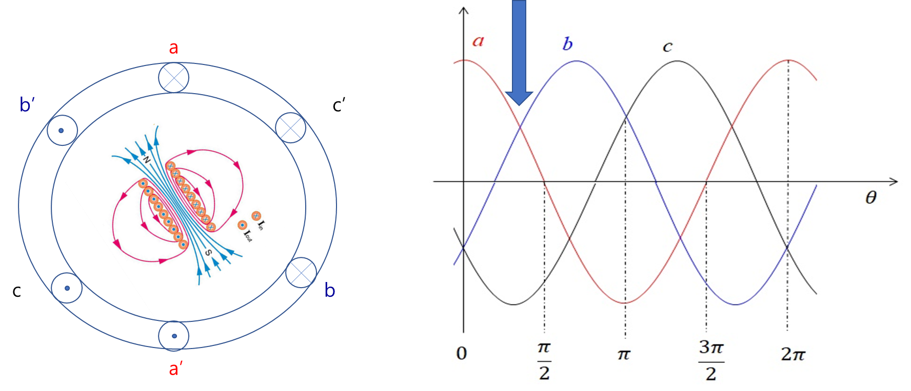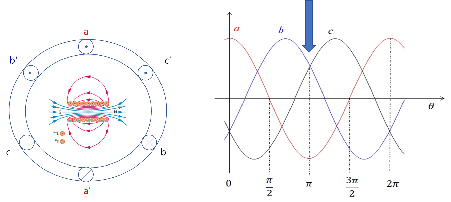 [그림3]를 살펴보겠습니다. [그림 3]에서는 3상 회전자계의 파란색 화살표 시점, 즉 π/3 시점을 살펴봅니다. a상은 -, b상 +, c상은 - 시점입니다. 따라서 전류의 흐름은 a로 나오고 a'로 들어가며, b로 들어가고 b'로 나오며, c로 나오고 c'로 들어갑니다.