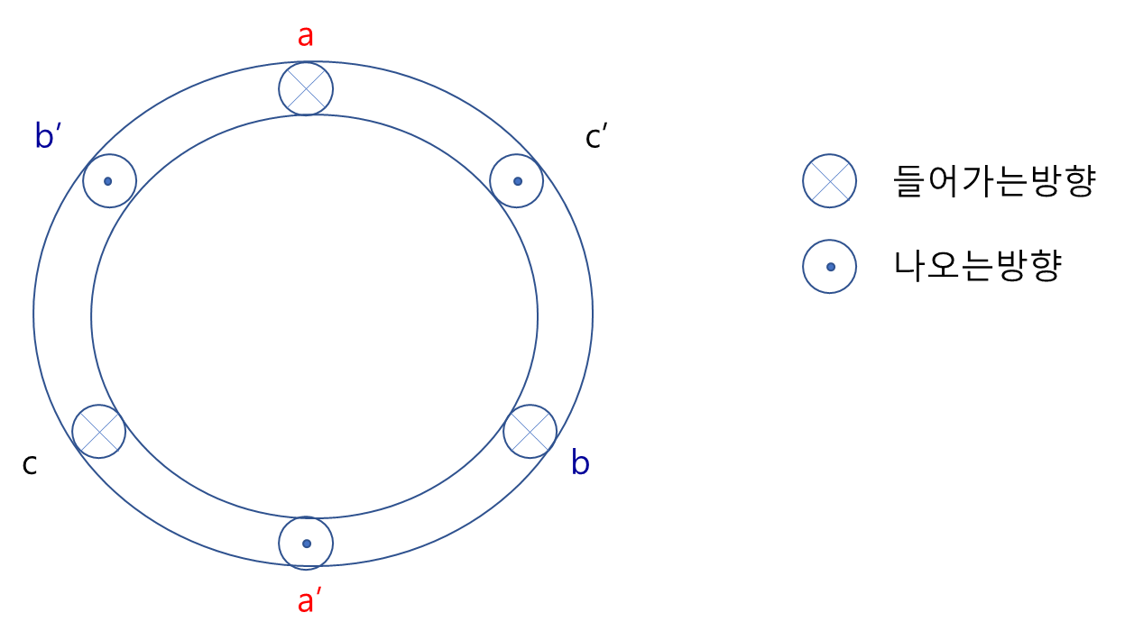 이로서 c', b, a' 위치에서 전류가 들어가고, c, b', a 위치에서 전류가 나옵니다. 앙페르 오른손 법칙을 이용해 전류의 방향대로 손을 말아쥐면 [그림3]와 같이 자계의 흐름을 예상해 볼 수 있습니다. 자계축이 약간 회전해서 a와 c'사이로 위치가 변경되었습니다.