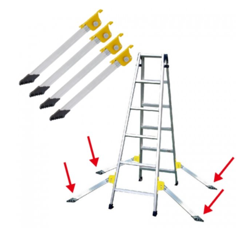 또한 사다리를 구조상 옆으로 넘어지기 쉬운 구조입니다. 전도를 방지하기 위해 아웃트리거가 있는 사다리를 사용하는 것은 필히 작업자가 챙겨야 합니다. 내가 쓰는 사다리가 아웃트리거가 없다면 담당 관리자에게 필히 신규 사다리를 구매 요구해야 합니다.